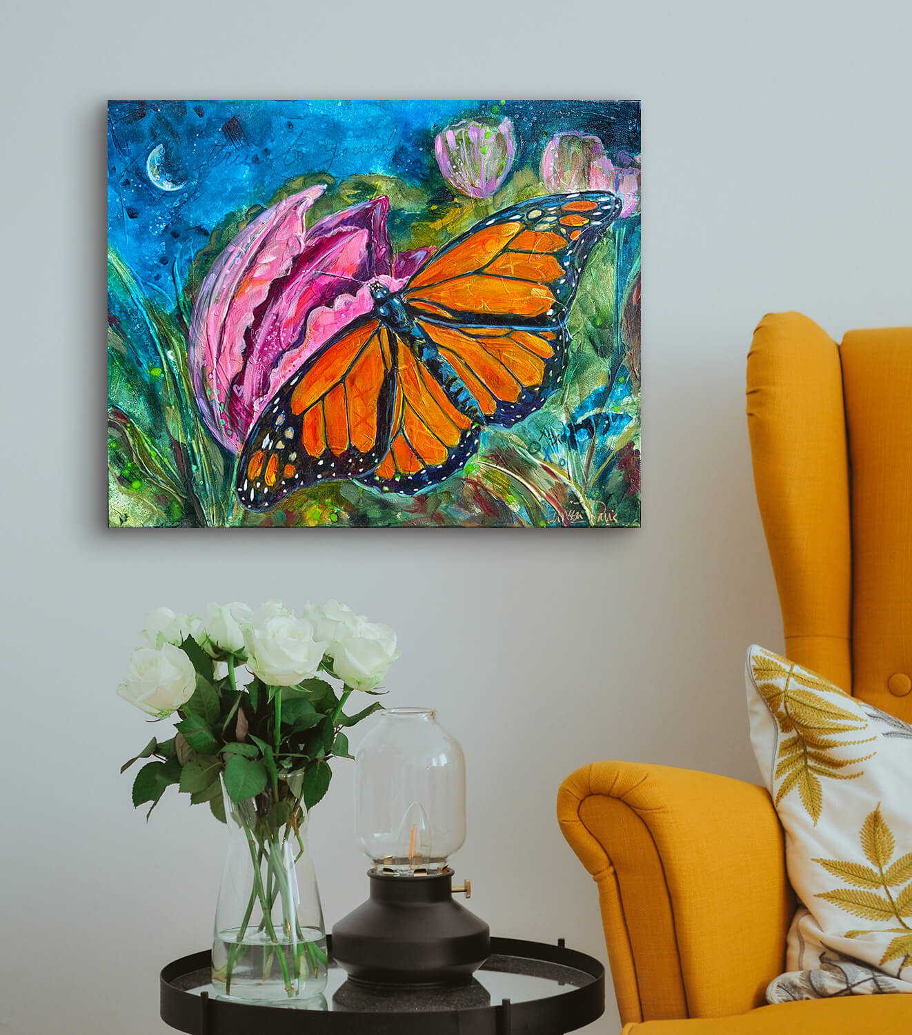 Monarchs carry symbolism of transformation and sovereignty. This is the message written into this piece: