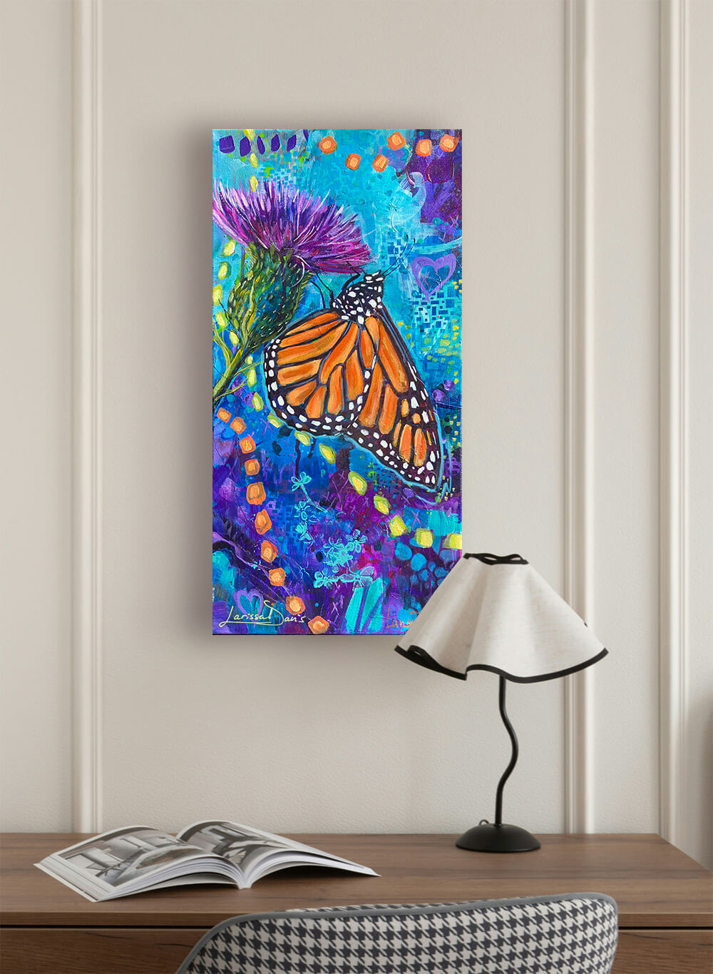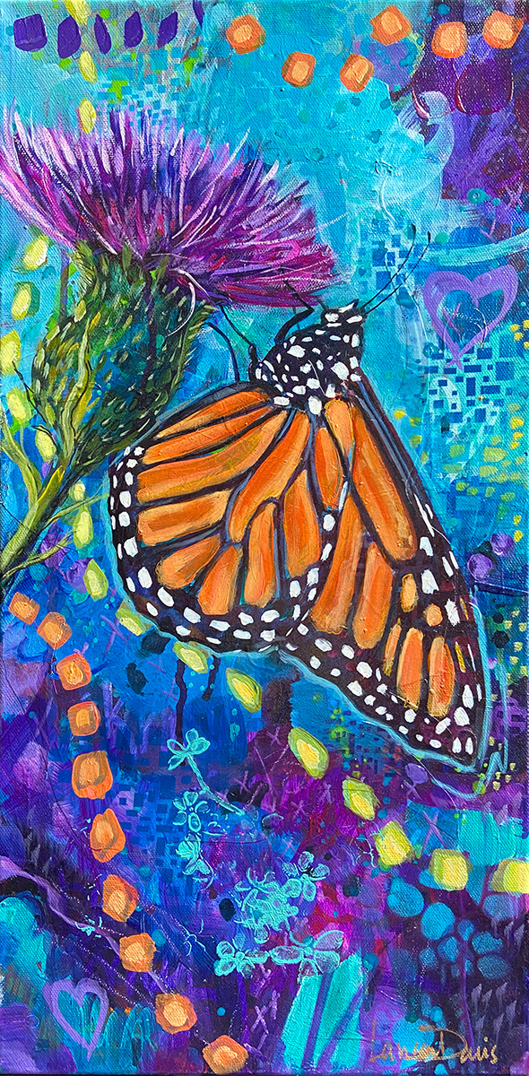 Monarchs carry symbolism of transformation and sovereignty, and symbolize our inner guidance and instructions, a blueprint guiding us to walk the path of our destiny. Thistles represent purification and protection.